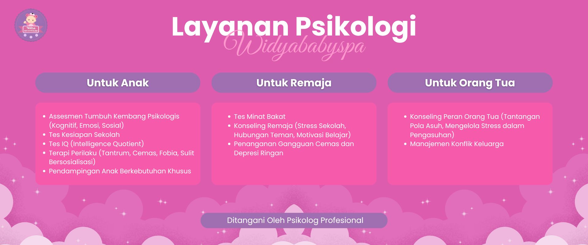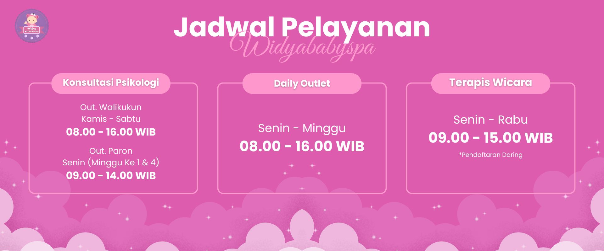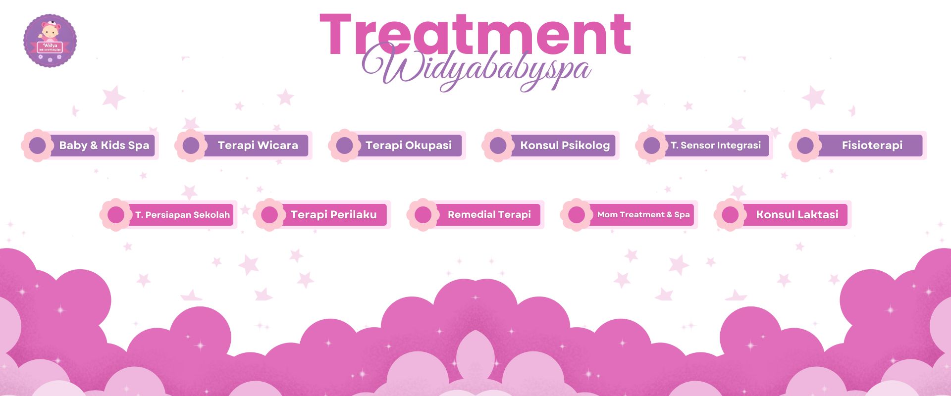 Widyababyspa adalah pusat layanan spa bayi profesional yang menawarkan pijat bayi (baby massage) dan hidroterapi (baby swim) untuk mengoptimalkan tumbuh kembang si kecil, meningkatkan kualitas tidur, dan mempererat ikatan orang tua dan bayi.